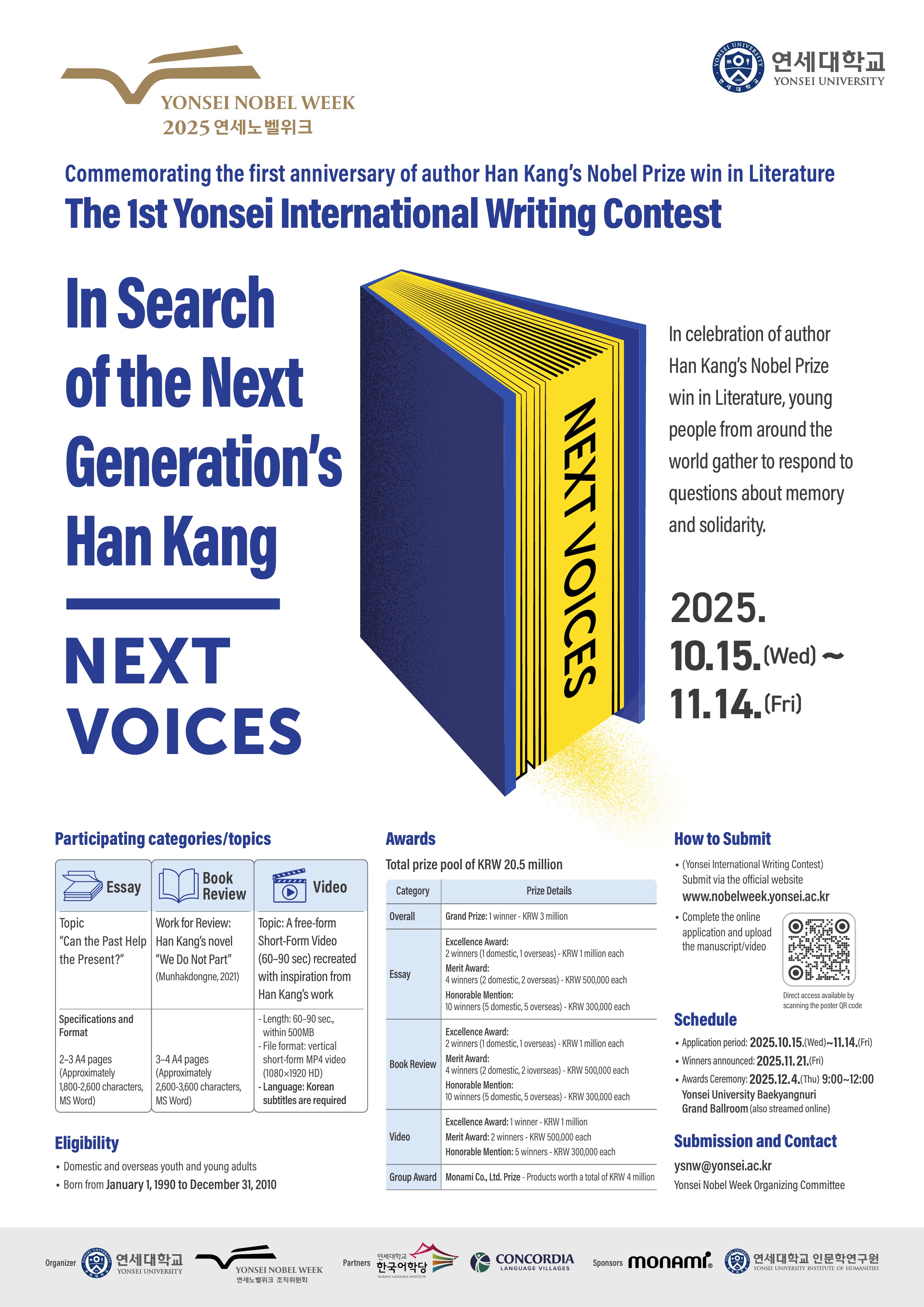 연세대학교는 한강 작가의 노벨문학상 수상 1주년을 기념하여 전 세계 청년들이 한강 작가와 공감하고 기억과 연대라는 주제에 응답하는 제1회 연세국제백일장 'NEXT VOICES'를 개최합니다.
