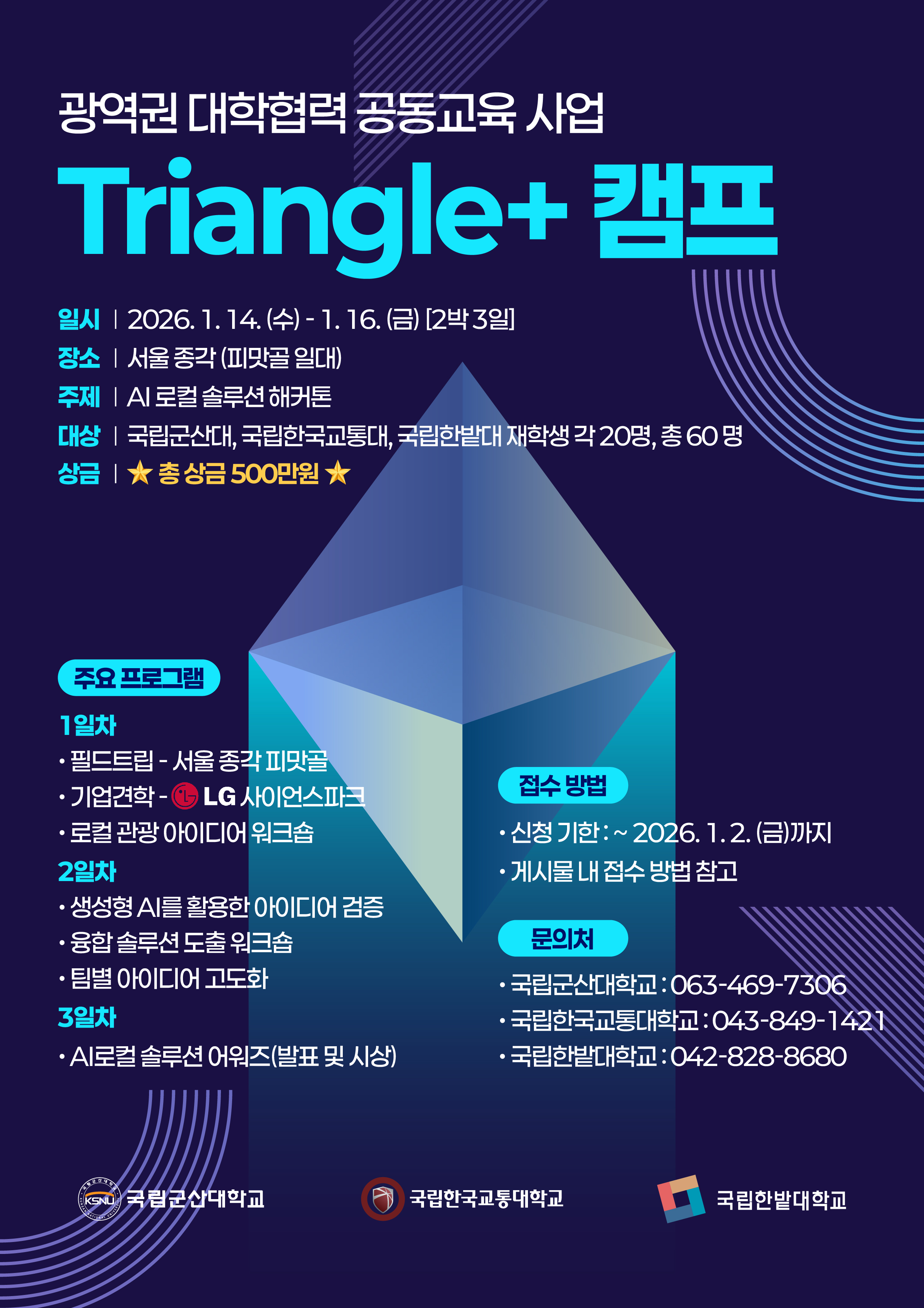 - 목적: 2025학년도 국립대학육성사업 동계 Triangle+ 캠프 (26. 1. 14.(수) ~ 1. 16.(금) 2박 3일간)