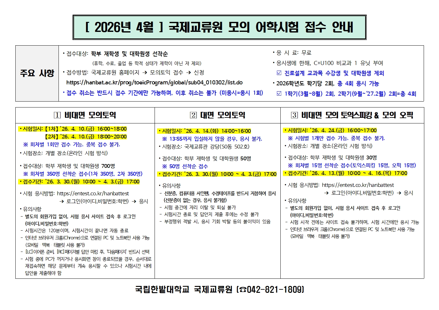 [국제교류원] 2026년 4월 모의 어학시험(토익,토익스피킹,오픽) 접수 안내