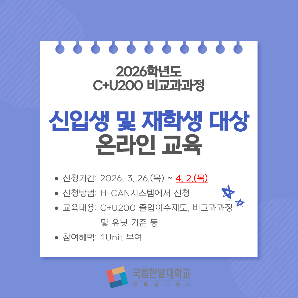 2. 참여방법: H-CAN시스템 > 프로그램 신청 > '2026학년도 C+U200 비교과과정 신입생 및 재학생 대상 온라인 교육' 프로그램 선택 > 신청접수