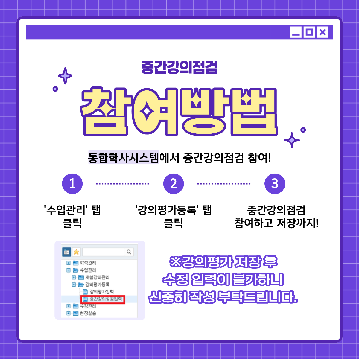 - 참여방법: 통합학사정보시스템 로그인 > 수업관리 > 강의평가등록 > 중간강의점검입력 > 저장