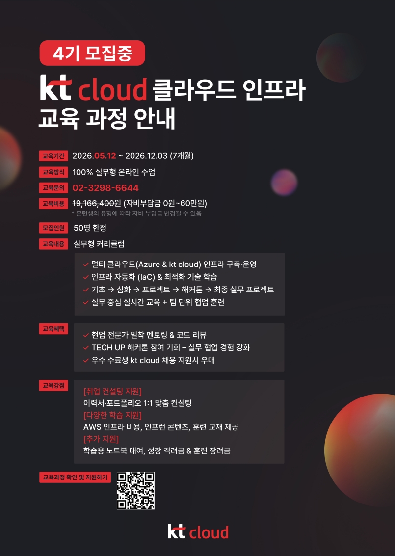 KT Cloud가 함께하는 클라우드 인프라 실무형 교육과정 4기 훈련생을 모집합니다.