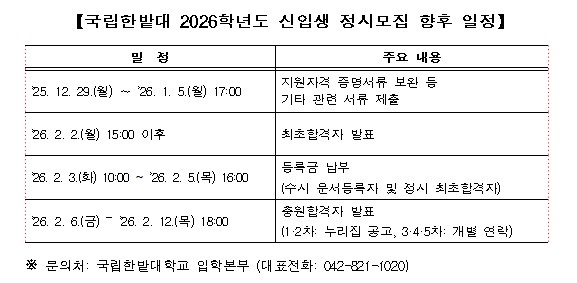 □ 국립한밭대「2026학년도 신입생 정시모집」전형별 최종 경쟁률은 다음과 같다.