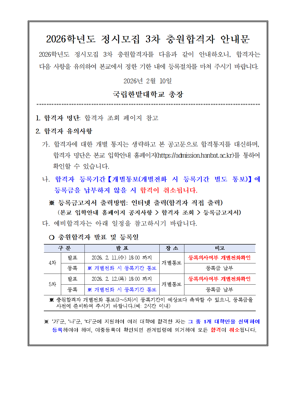 2026학년도 정시모집 3차 충원합격자 발표를 다음과 같이 안내하오니 합격자는 붙임의 안내사항을 반드시 숙지하여 등록금 미납으로 인한 합격 취소 등의 불이익을 받지 않도록 유의하여 주시기 바랍니다.