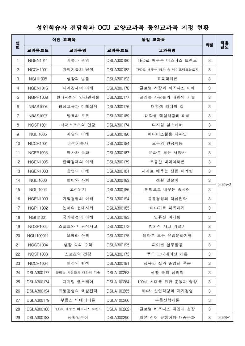 성인학습자 전담학과 OCU 교양교과목 동일교과목 지정 현황