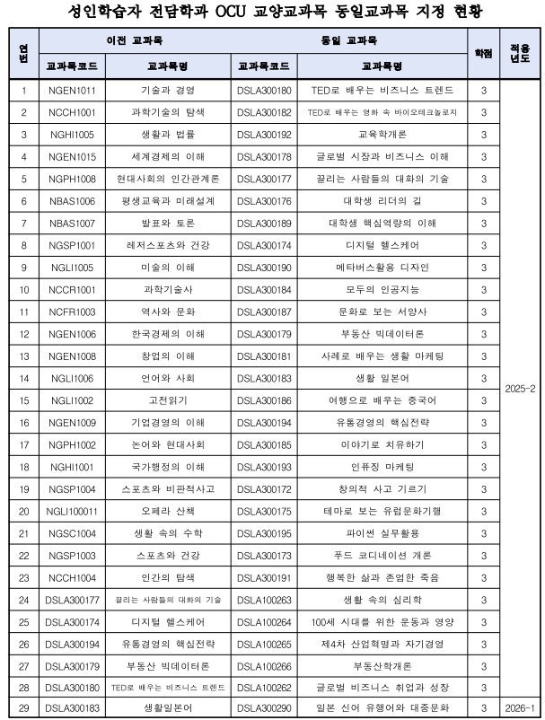성인학습자 전담학과 OCU 교양교과목 동일교과목 지정 현황(2025.11.).pdf [90 KB]