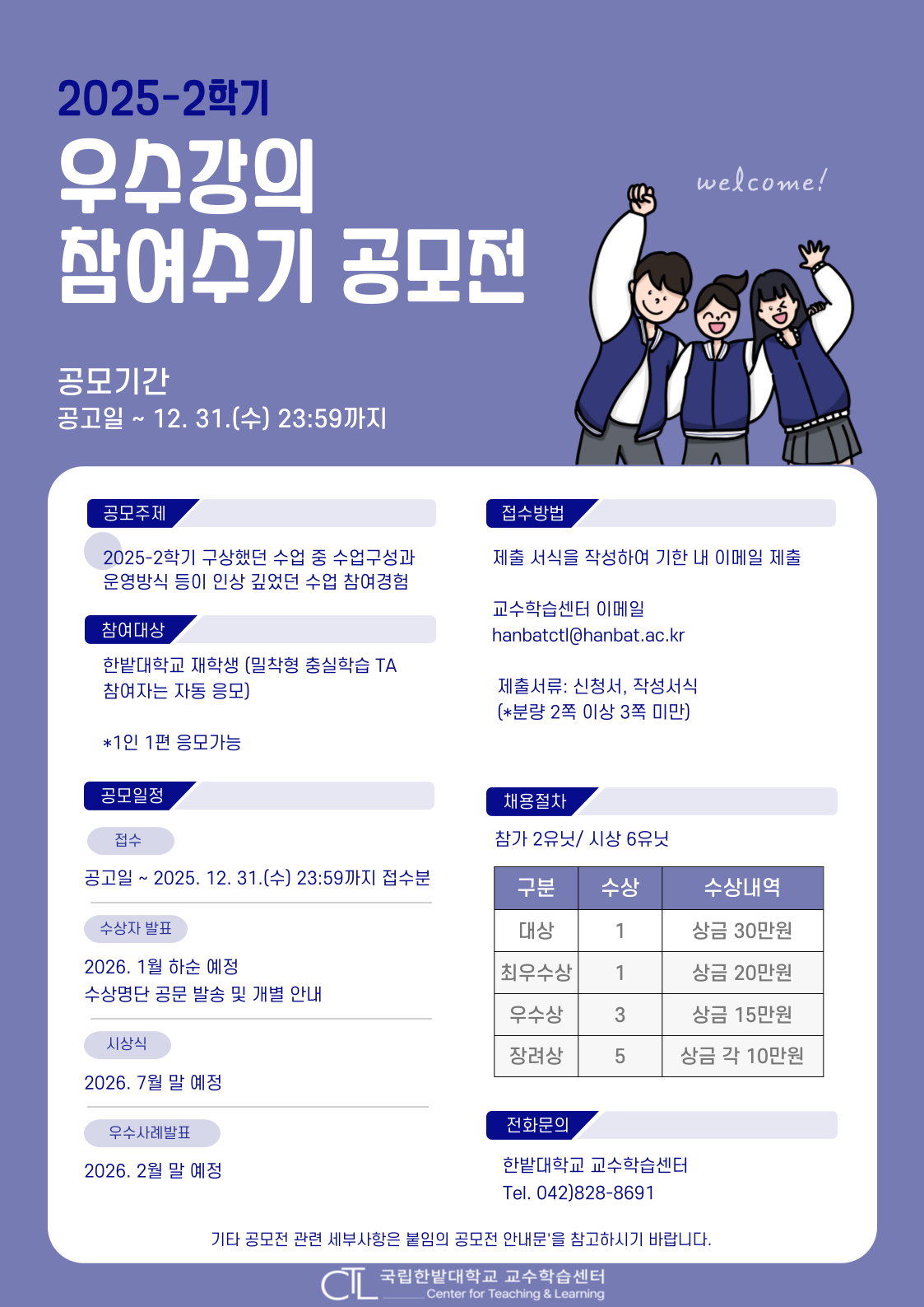 ■ 교수학습센터에서는 한밭 맞춤형 교수학습방법인 ‘밀착형 충실학습’에 대한 인식을 확산하고, 학내 교수법 우수사례를 발굴하기 위하여 2025-2학기 밀착형 충실학습 우수사례 공모전을 다음과 같이 실시하오니 학생들의 많은 참여 바랍니다.