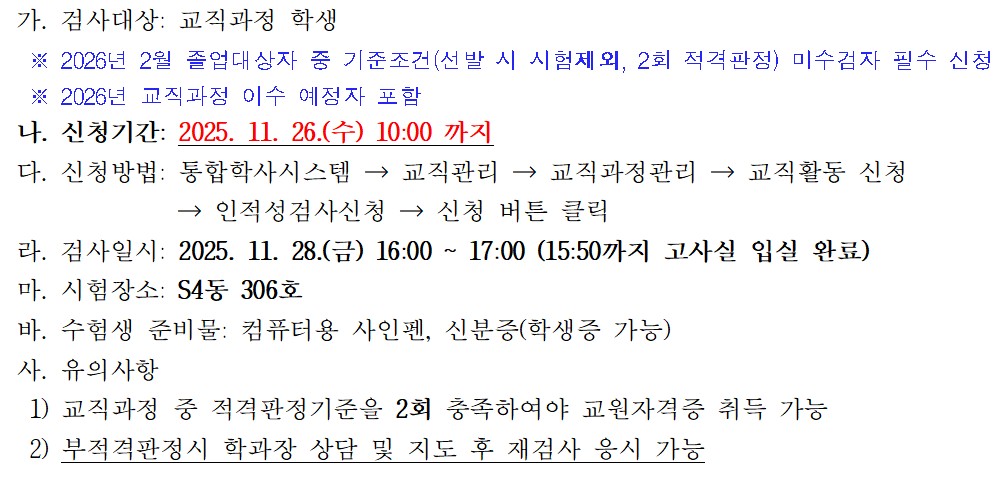 2025학년도 교직과정 적성 및 인성 검사 안내