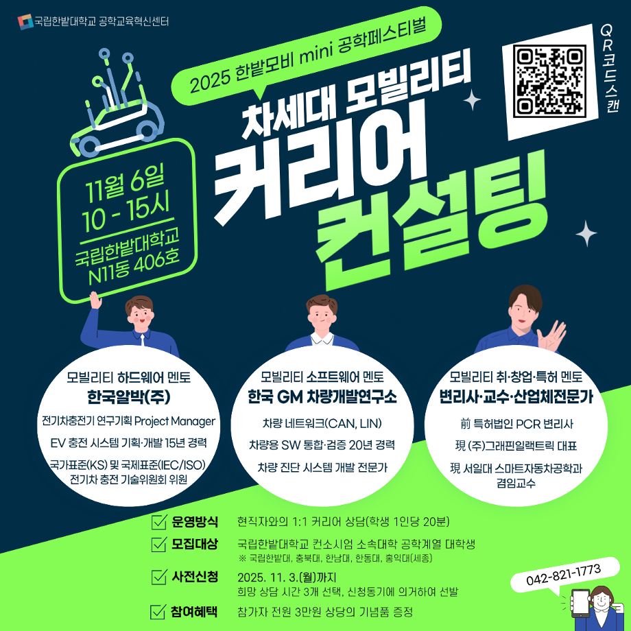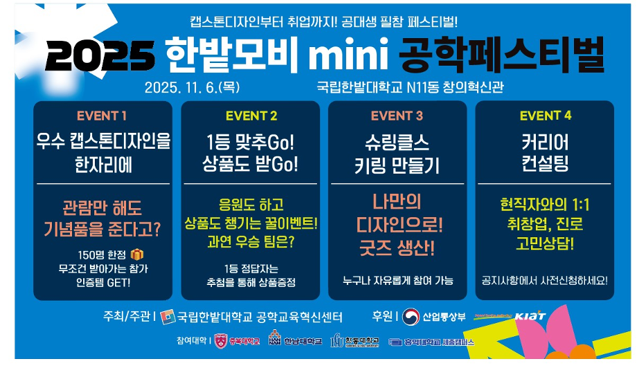 공학교육혁신센터에서「2025 한밭모비 mini 공학페스티벌」의 일환으로 산업체 전문가와 대학생이 1:1 진로 상담을 진행하는‘커리어 컨설팅’프로그램을 아래와 같이 운영하고자 하오니, 많은 학생들의 참여 바랍니다.