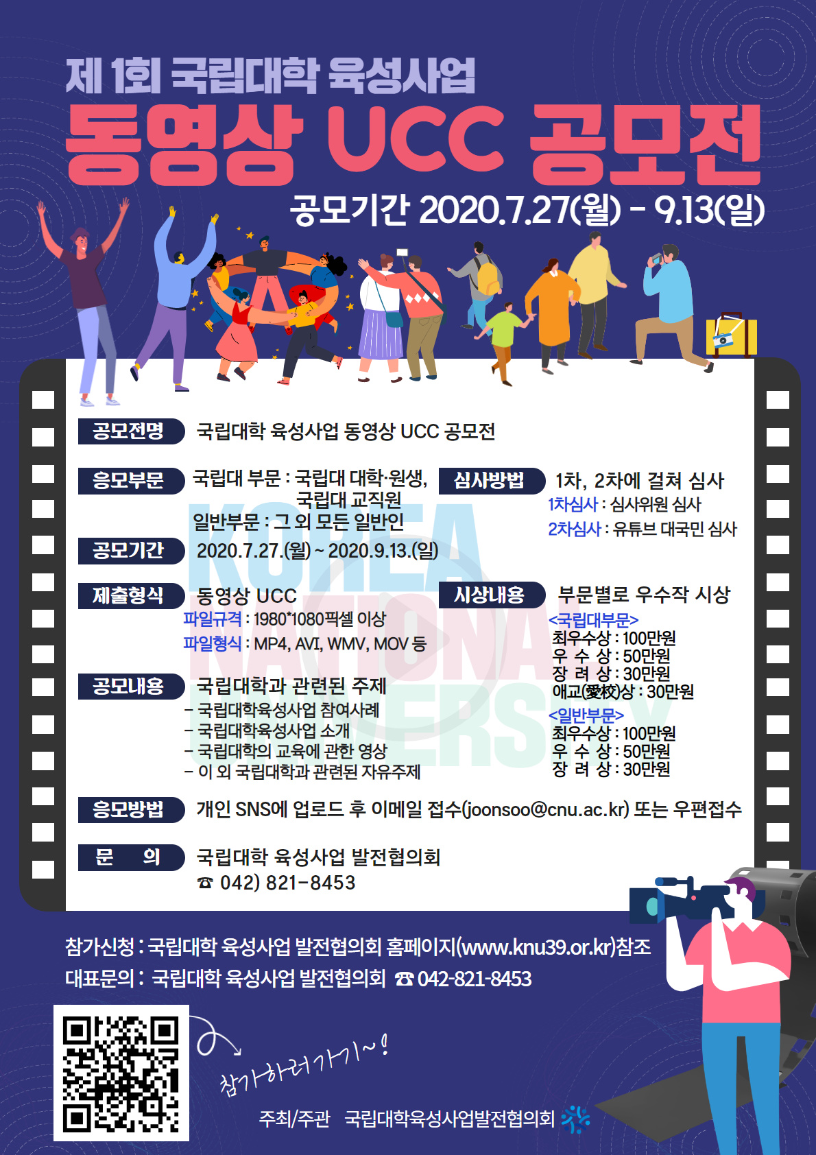 국립대학 육성사업 발전협의회에서는 "제1회 국립대학 육성사업 동영상 UCC 공모전"을 아래와 같이 개최합니다.