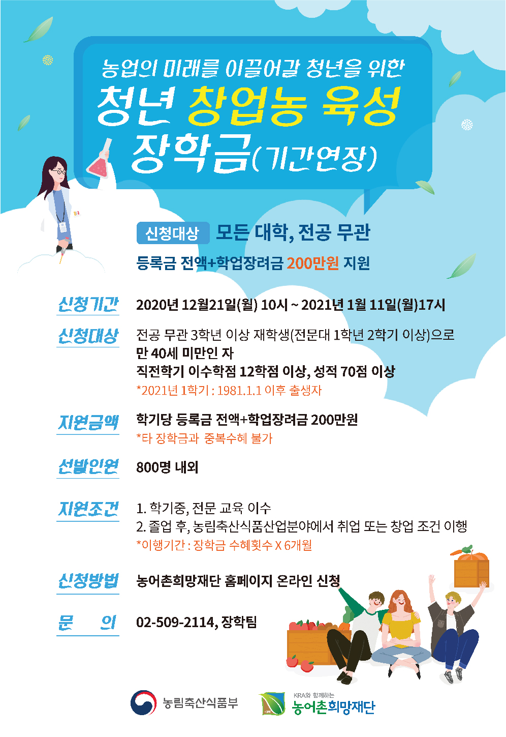[농어촌희망재단] 2021학년도 청년창업농육성장학생 모집기간 연장 안내