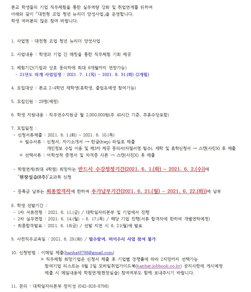 2021년도 하계방학 대전형 코업 뉴리더 양성사업(직무체험) 참여자 모집(기업리스트 추가)