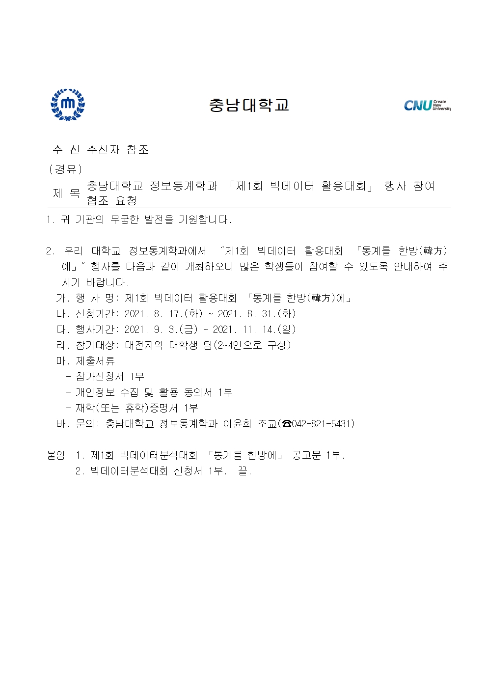 충남대학교 정보통계학과 「제1회 빅데이터 활용대회」 행사 안내