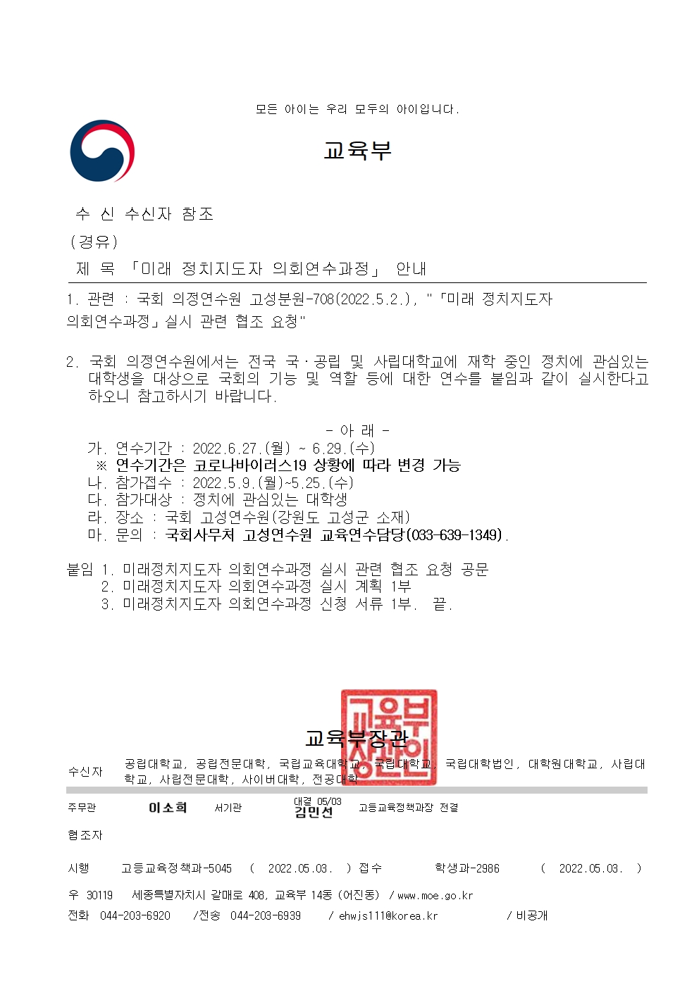 (공문) 「미래정치지도자 의회연수과정」실시 관련 협조 요청.pdf [181 KB]