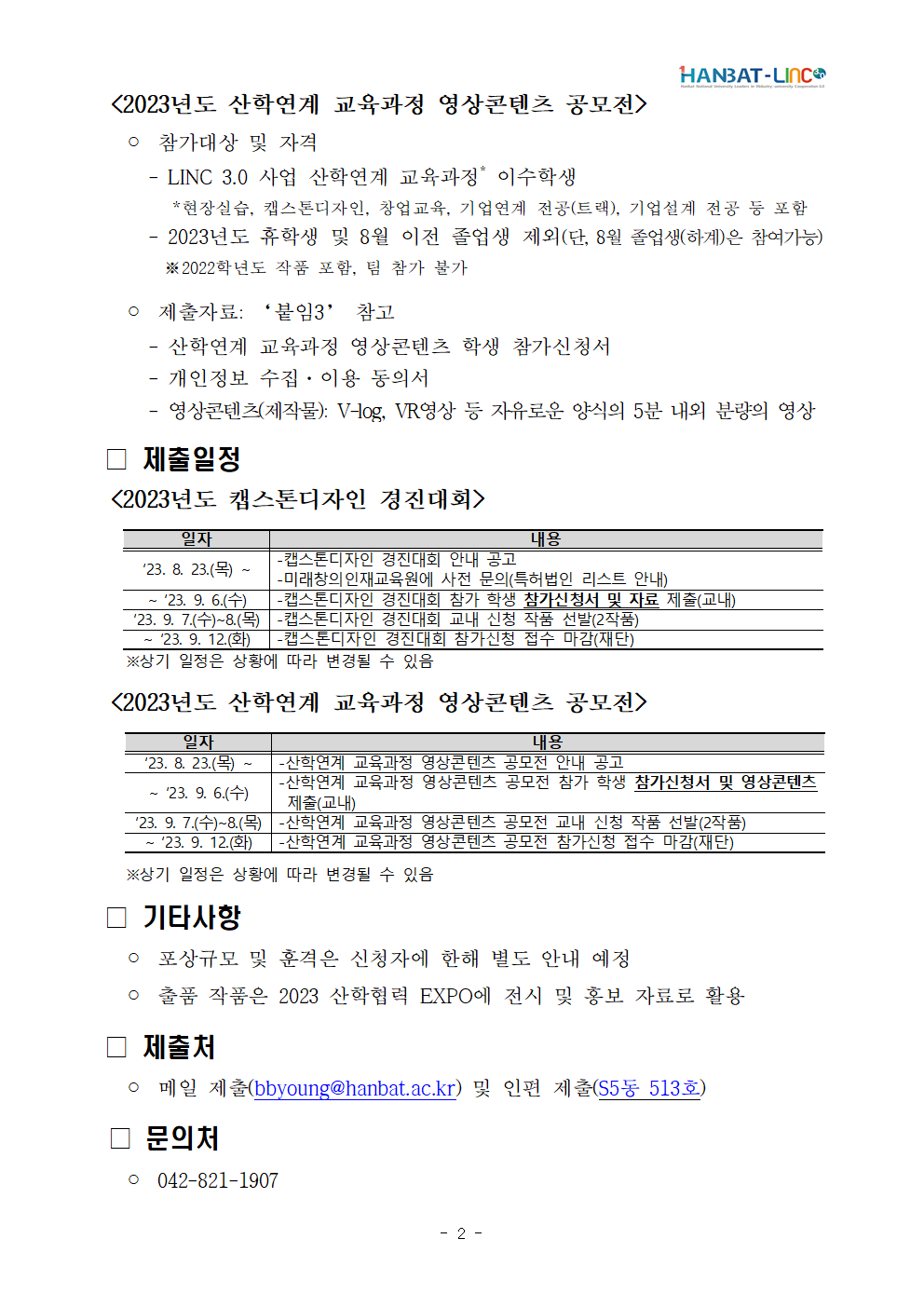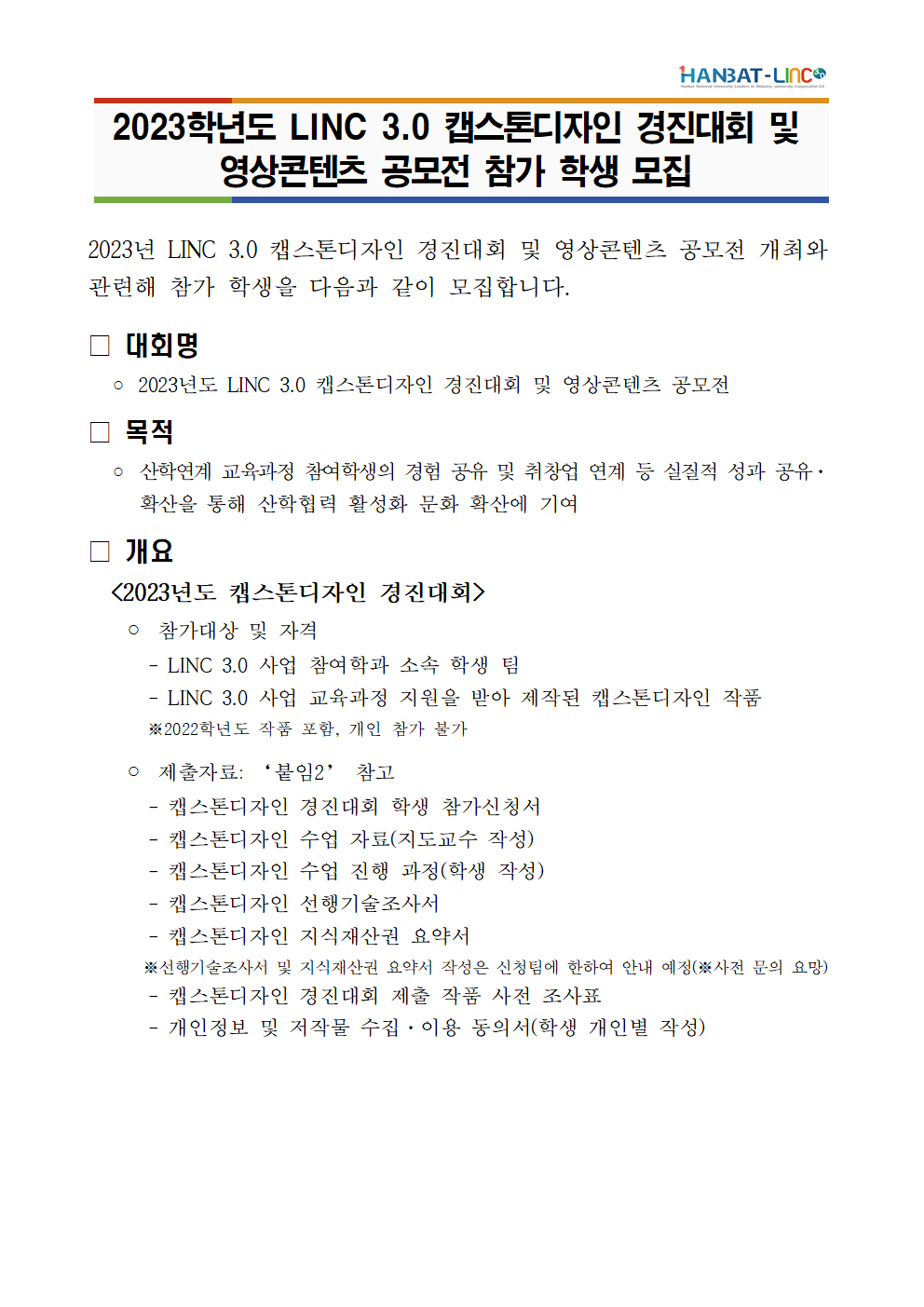 2023학년도 LINC 3.0 캡스톤디자인 경진대회 및 영상콘텐츠 공모전 참가 학생 모집 공고
