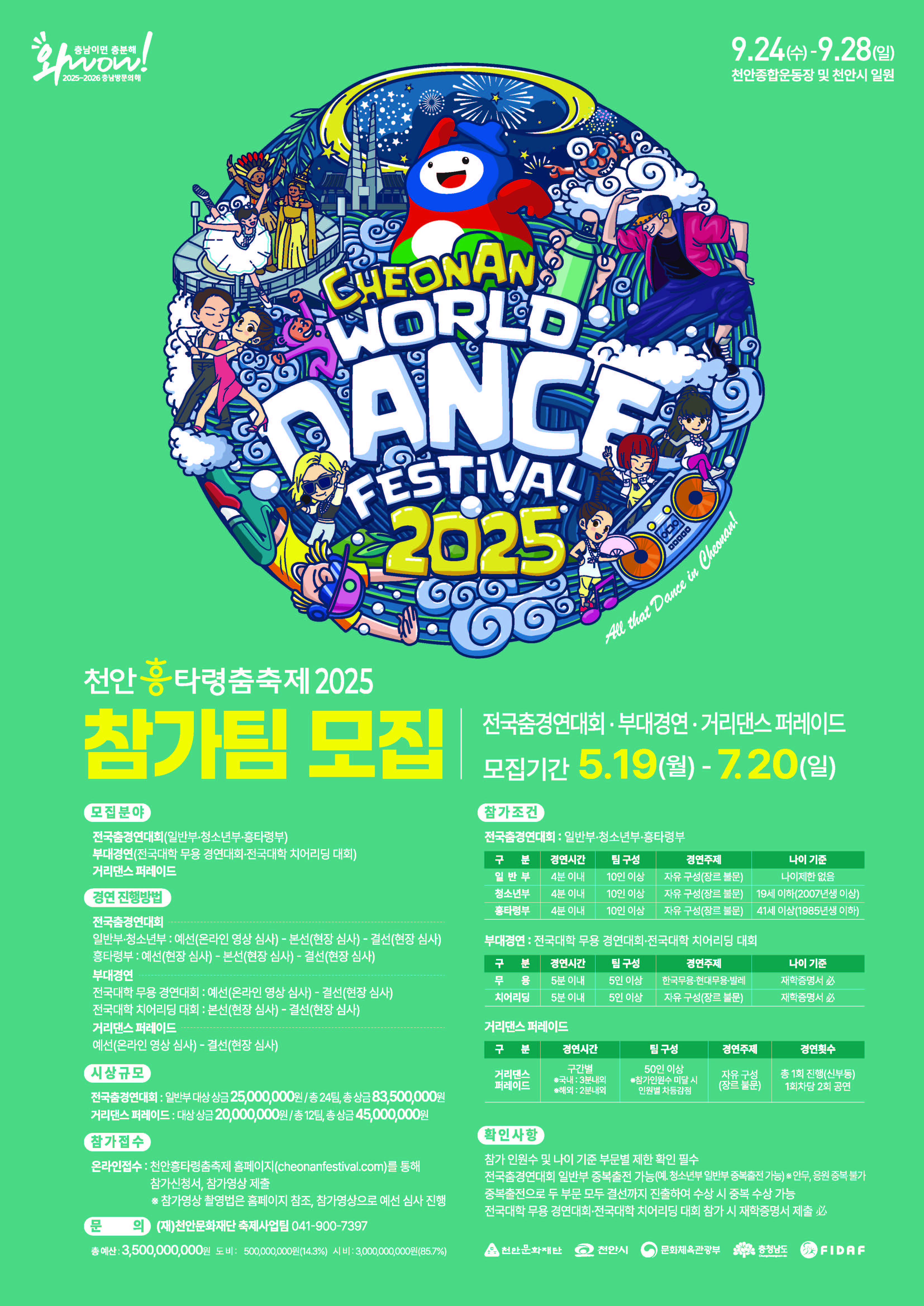 문화체육관광부 선정 명예 문화관광축제 <천안흥타령춤축제 2025>가 2025년 9월 24일(수) ~ 9월 28(일)까지 5일간 천안종합운동장 미 천안시 일원에서 개최됩니다. <천안흥타령춤축제 2025> 주요 프로그램인 전국춤경연대회, 거리댄스퍼레이드, 부대경연 참가팀을 모집하고 있으니 자세한 사항은 포스터 및 붙임파일을 참고하시기 바랍니다.