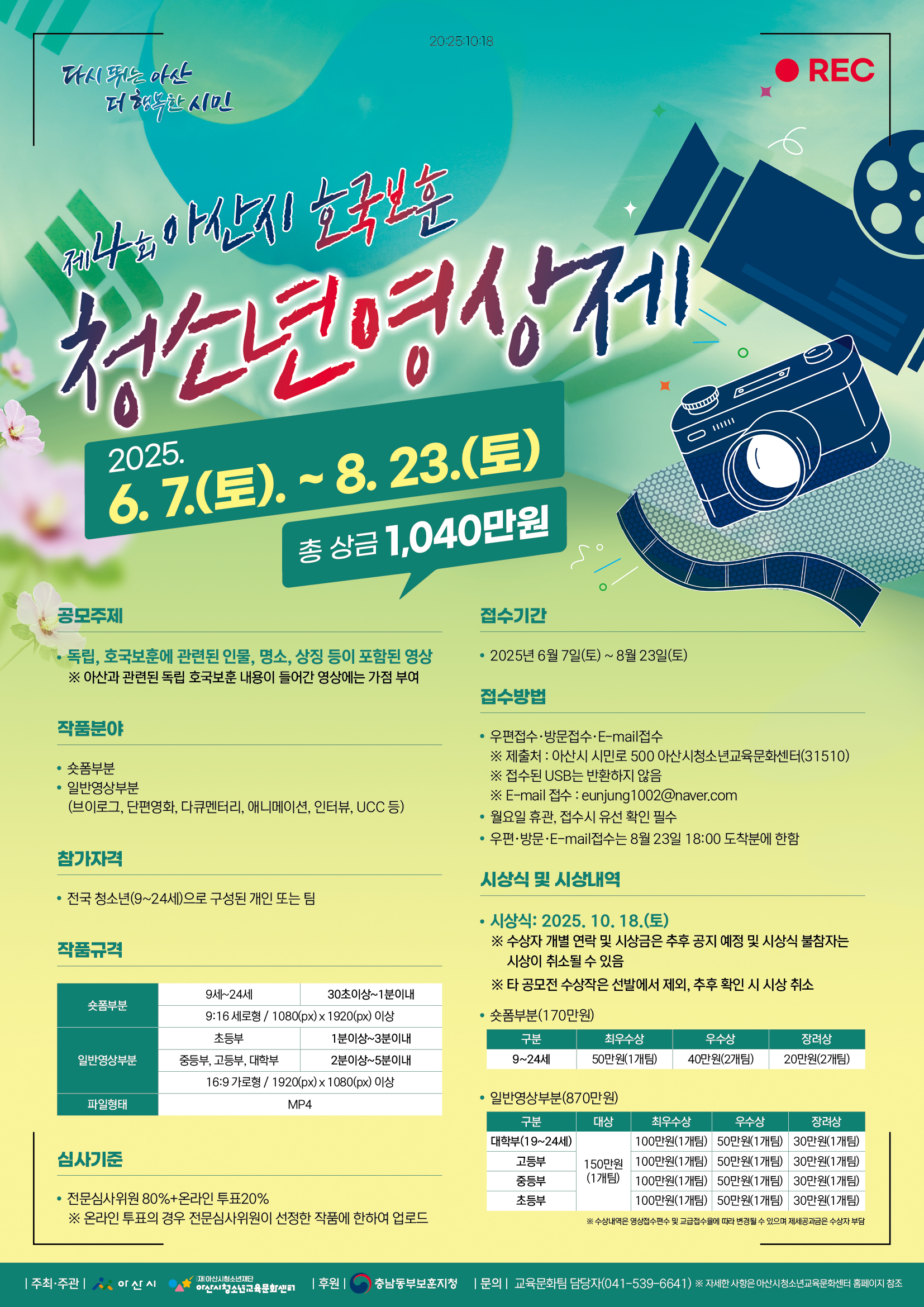 아산시청소년교육문화센터에서는 호국보훈에 대한 관심과 이해를 높이고 나라사랑 정신을 계승하고자 [제4회 아산시 전국 호국보훈 청소년영상제]를 운영하고 있습니다. 자세한 사항은 포스터 및 붙임파일을 참고하여 주시기 바랍니다.