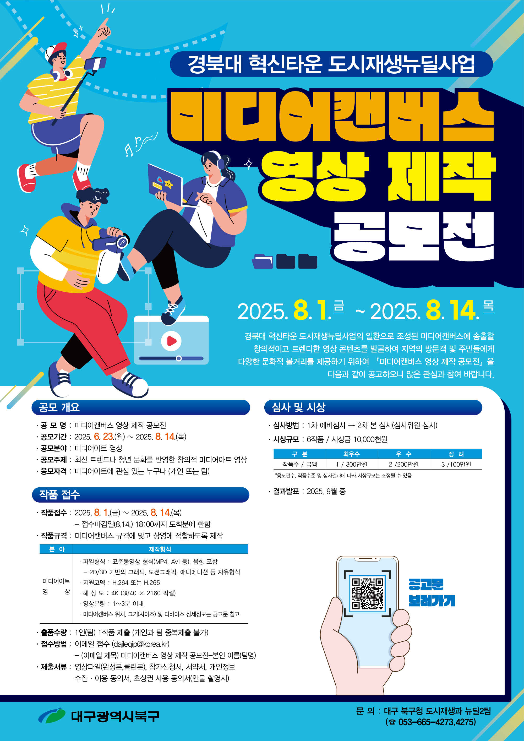 대구광역시 북구에서는 경북대 혁신타운 도시재생뉴딜사업의 일환으로 경북대학교 평생교육원 벽면에 조성되어 있는 미디어캔버스에 송출할 창의적이고 트렌디한 영상 콘텐츠 발굴을 위해 '미디어캔버스 영상 제작 공모전'을 개최하고 있습니다.