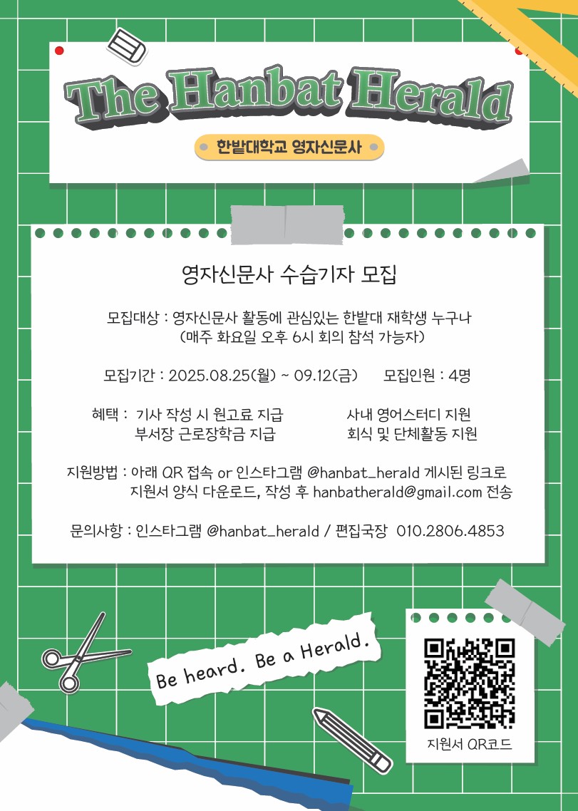한밭대학교 영자신문사 The Hanbat Herald에서 수습기자를 모집하고 있습니다.
