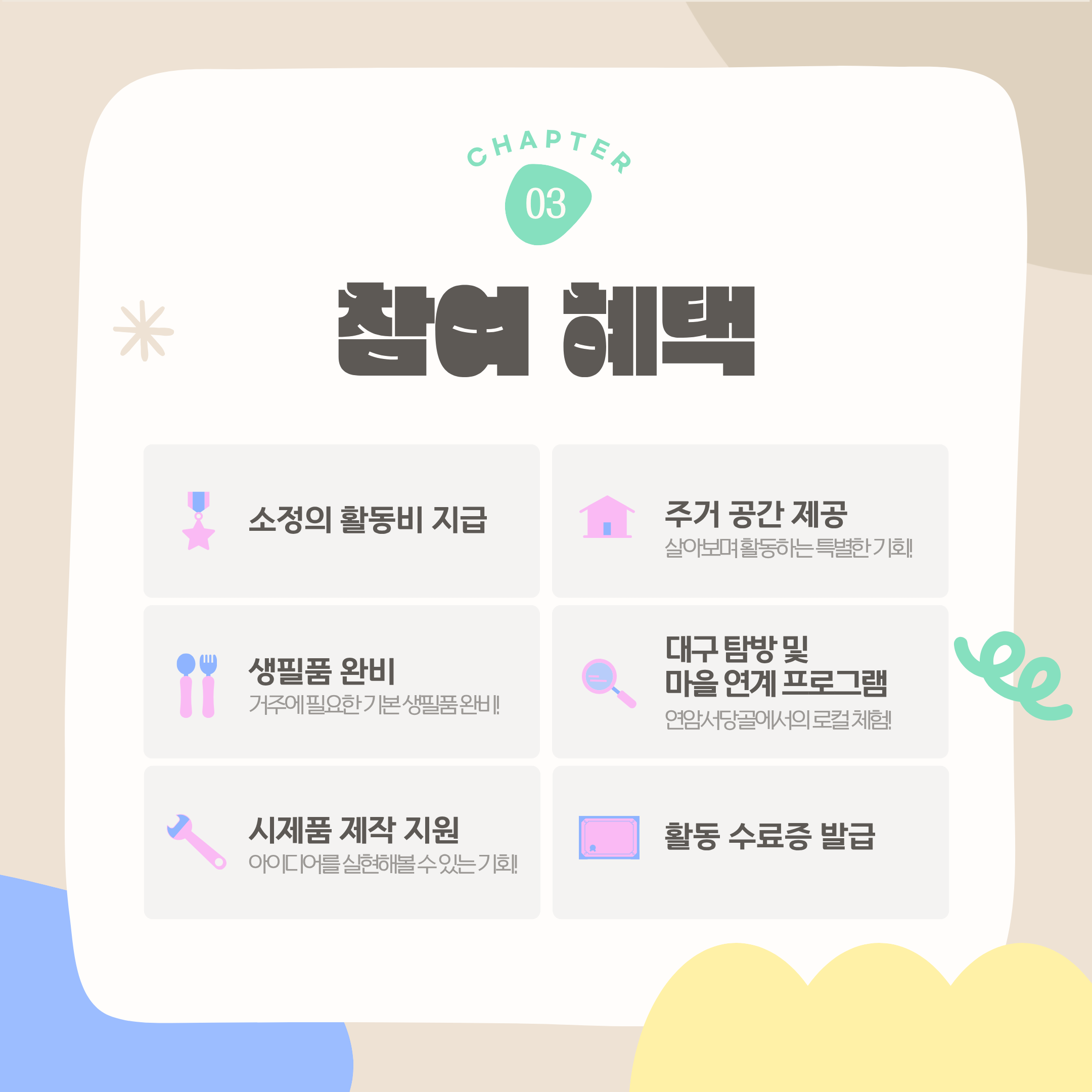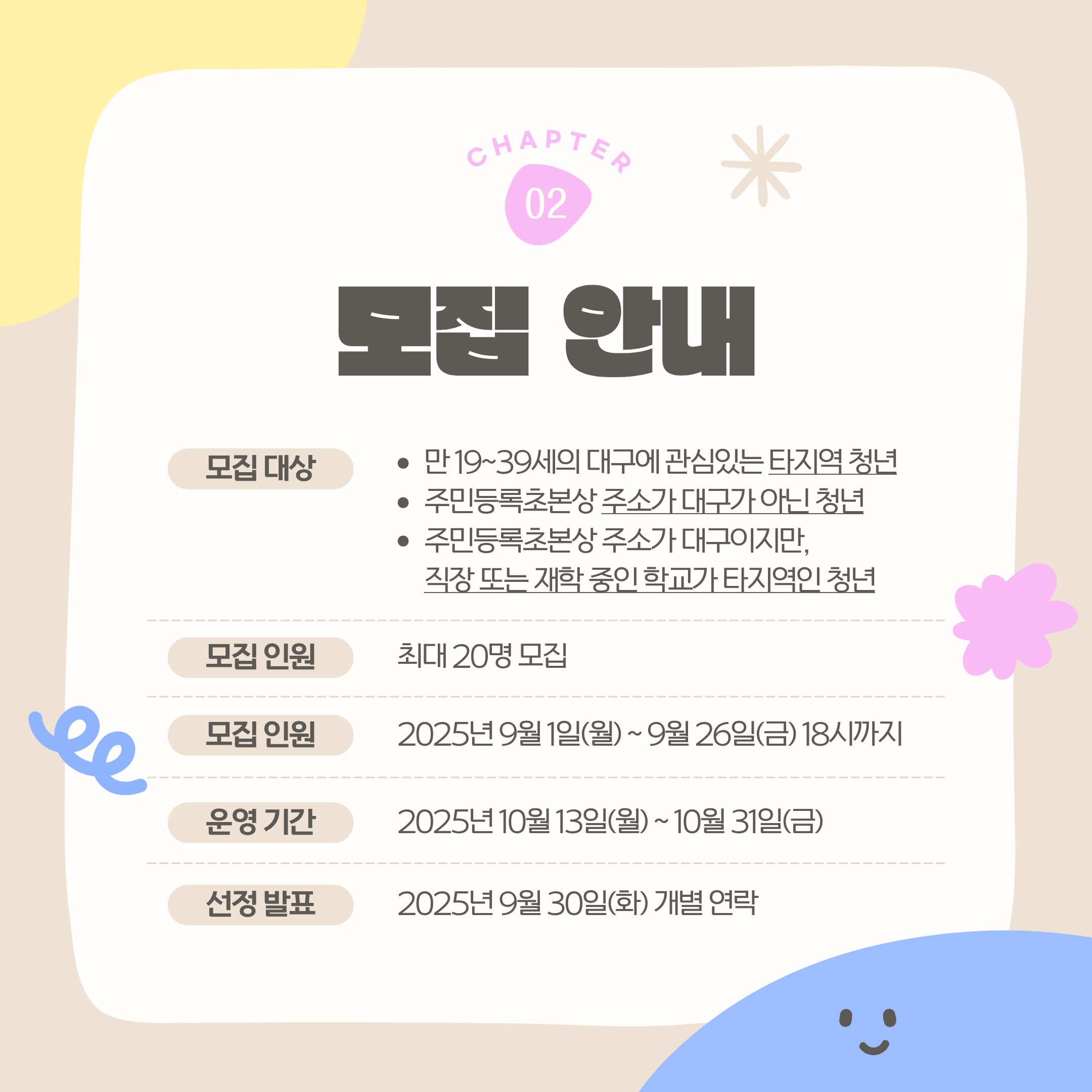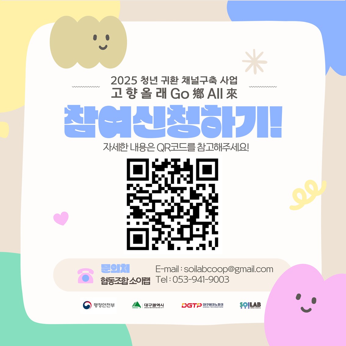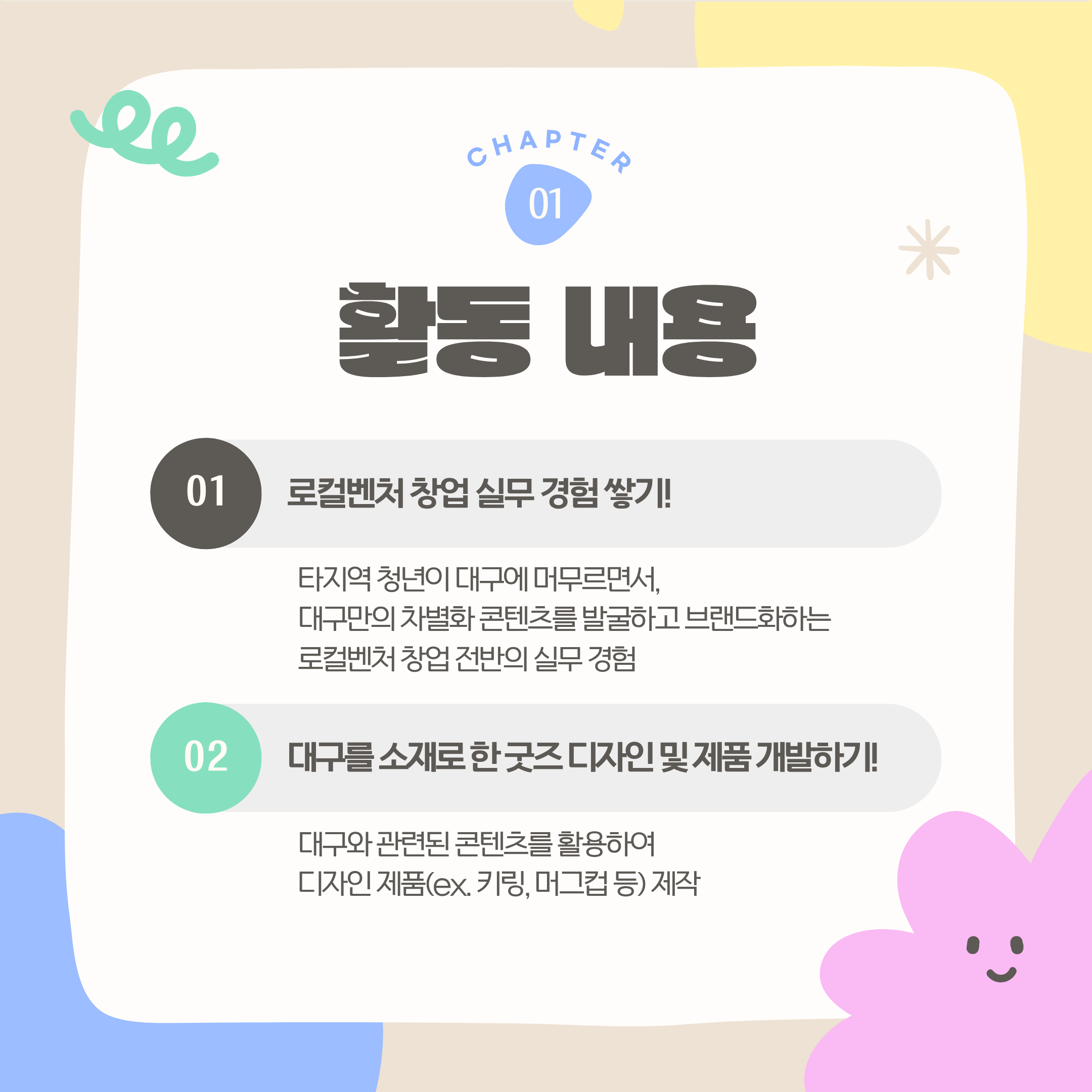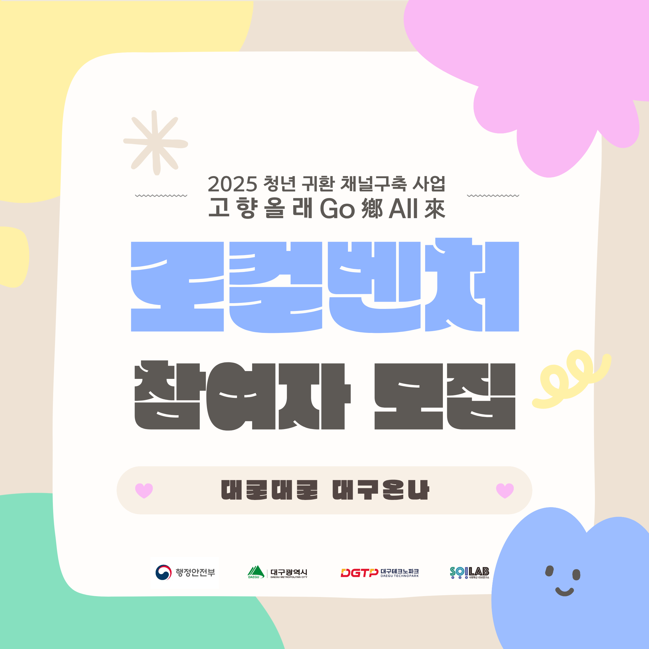 대구광역시와 대구테크노파크에서는 타지역 청년이 대구에 머물면서 대구만의 고유한 특성과 차별화된 로컬브랜드 개발 실무 경험을 제공하기 위해 '청년 귀환 채널구축 사업(고향올래)' 로컬벤처 창업 프로그램을 시행합니다.