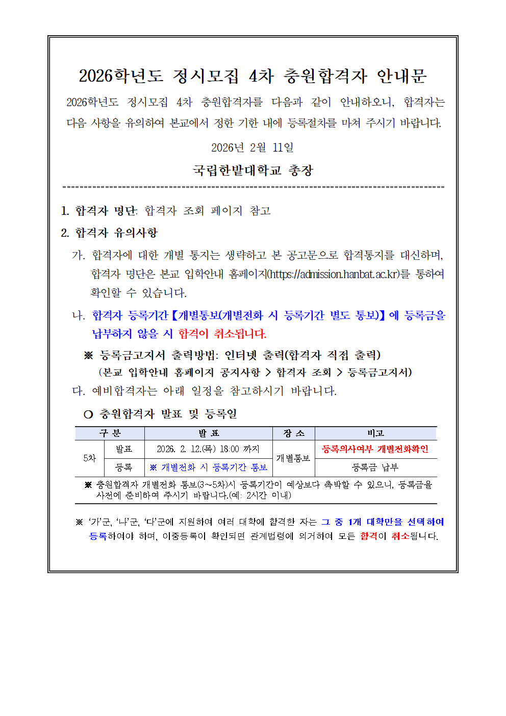 2026학년도 정시모집 4차 충원합격자 발표를 다음과 같이 안내하오니 합격자는 붙임의 안내사항을 반드시 숙지하여 등록금 미납으로 인한 합격 취소 등의 불이익을 받지 않도록 유의하여 주시기 바랍니다.