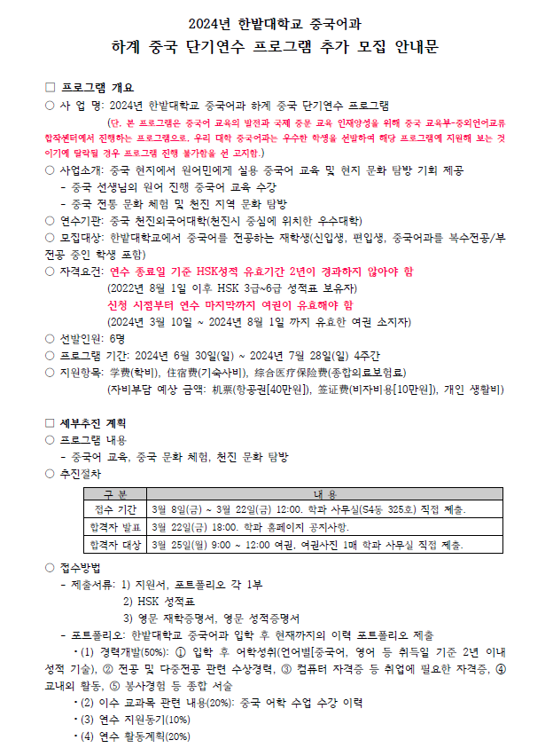 2024년 한밭대학교 중국어과 하계 중국 단기연수 프로그램 추가 모집 안내드립니다.