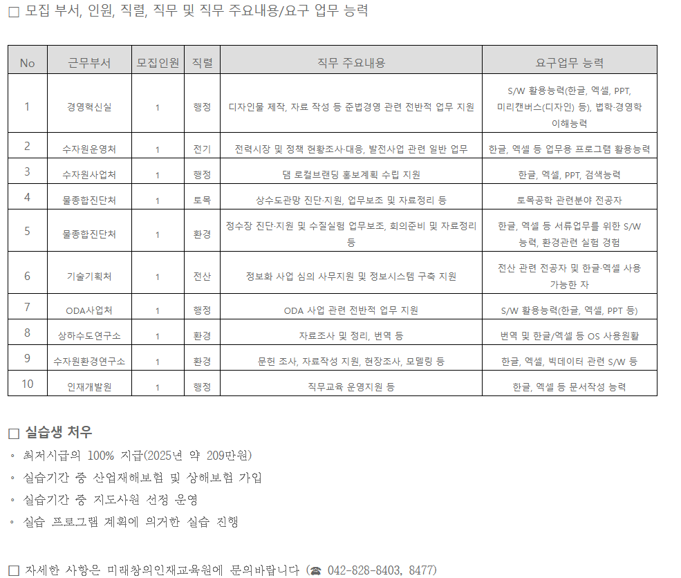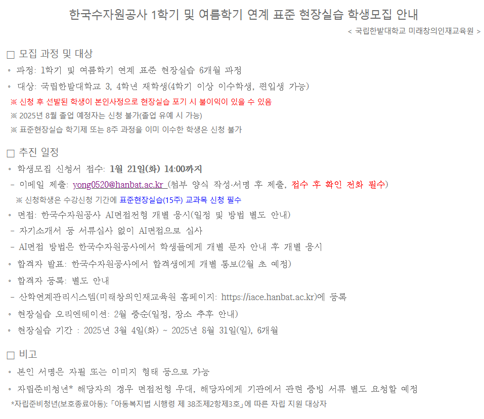 [한국수자원공사] 2025년 1학기 및 여름학기 연계 표준 현장실습학기제 학생 모집 안내