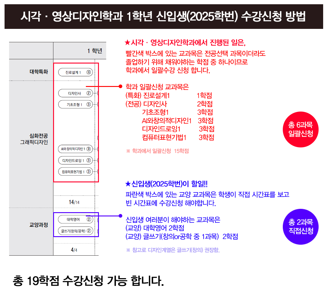 ★중요★ 시각·영상디자인학과 1반, 2반 시간표 확인후 학생이 신청할 수 있는 시간대 참고하여 수강신청하기!!