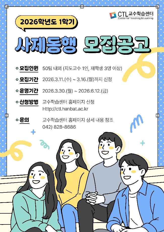교수학습센터에서는 신입생 및 재학생의 대학생활 적응 맞춤형 지원 강화를 위하여 「2026학년도 1학기 사제동행 프로그램」을 다음과 같이 실시하고자 하오니 관심있는 학생들은 신청하기 바랍니다.