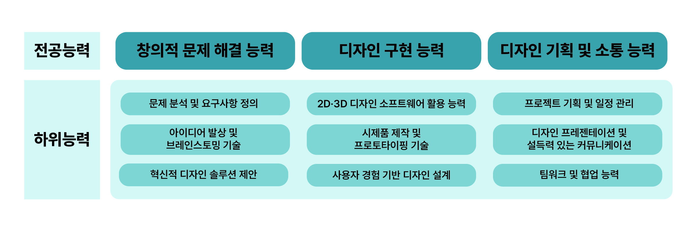 전공능력 : 창의적 문제 해결 능력, 디자인 구현 능력, 디자인 기획 및 소통 능력