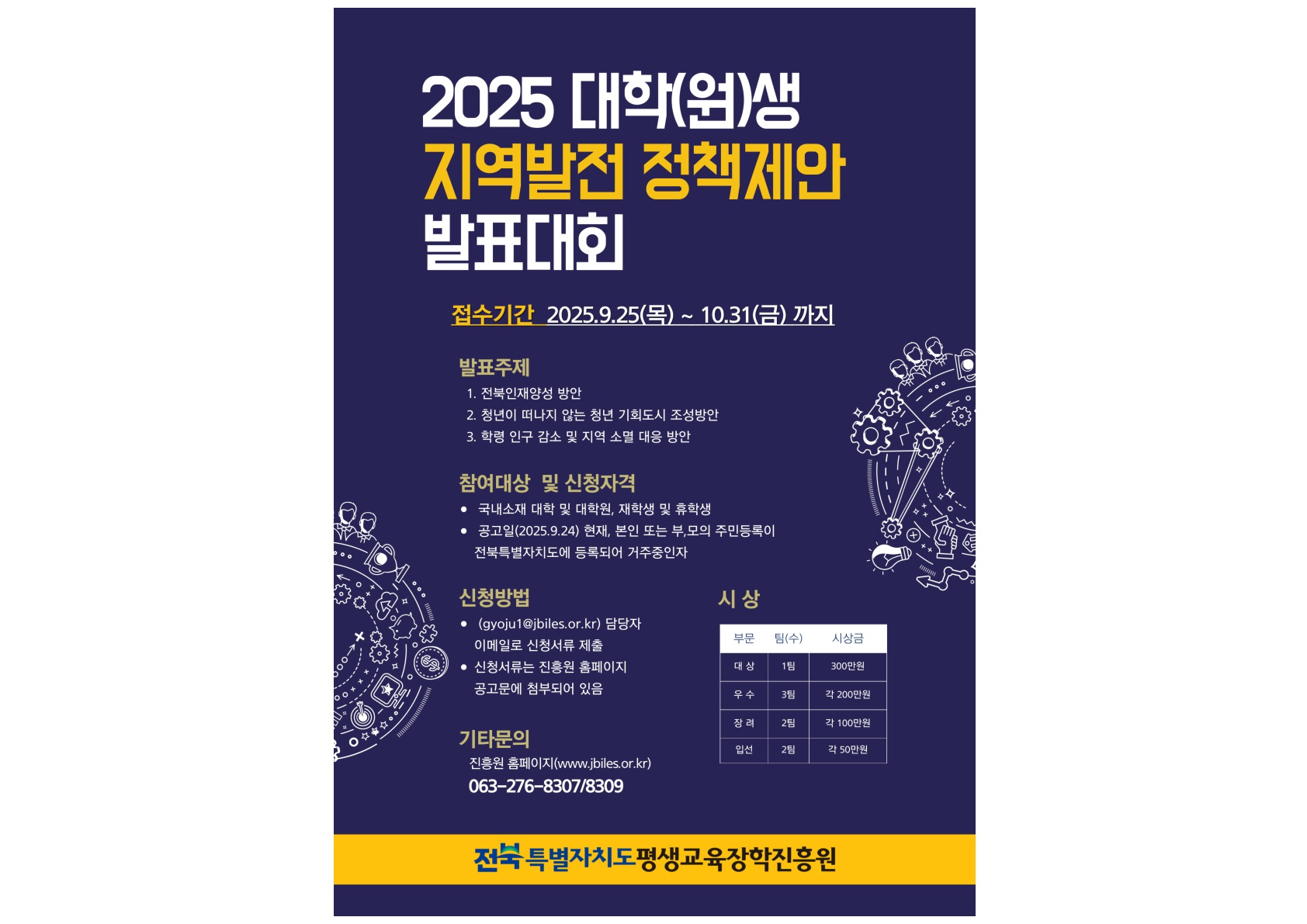 전북특별자치도평생교육장학진흥원에서는 전국 연고 대학(원)생들이 지역 현안문제에 대한 창의적인 정책 아이디어를 발굴, 이를 통해 자기역량 개발과 전북에 대한 관심 및 애향심을 높이는 기회를 제공하는 2025년 '대학(원)생 지역발전 정책제안 발표대회'를 추진하고 있습니다.