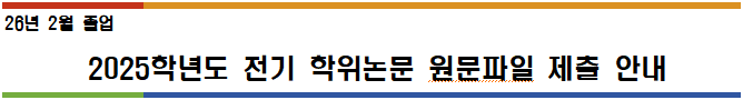 - 도서관에서는 논문 양식 및 내용, 표절과 저작권 문제에 대해 점검하지 않으며, 관련 문제로 인해 발생하는 피해에 대해 책임지지 않습니다. 위 사항은 각 학과 및 대학원 행정실로 문의하시기 바랍니다.