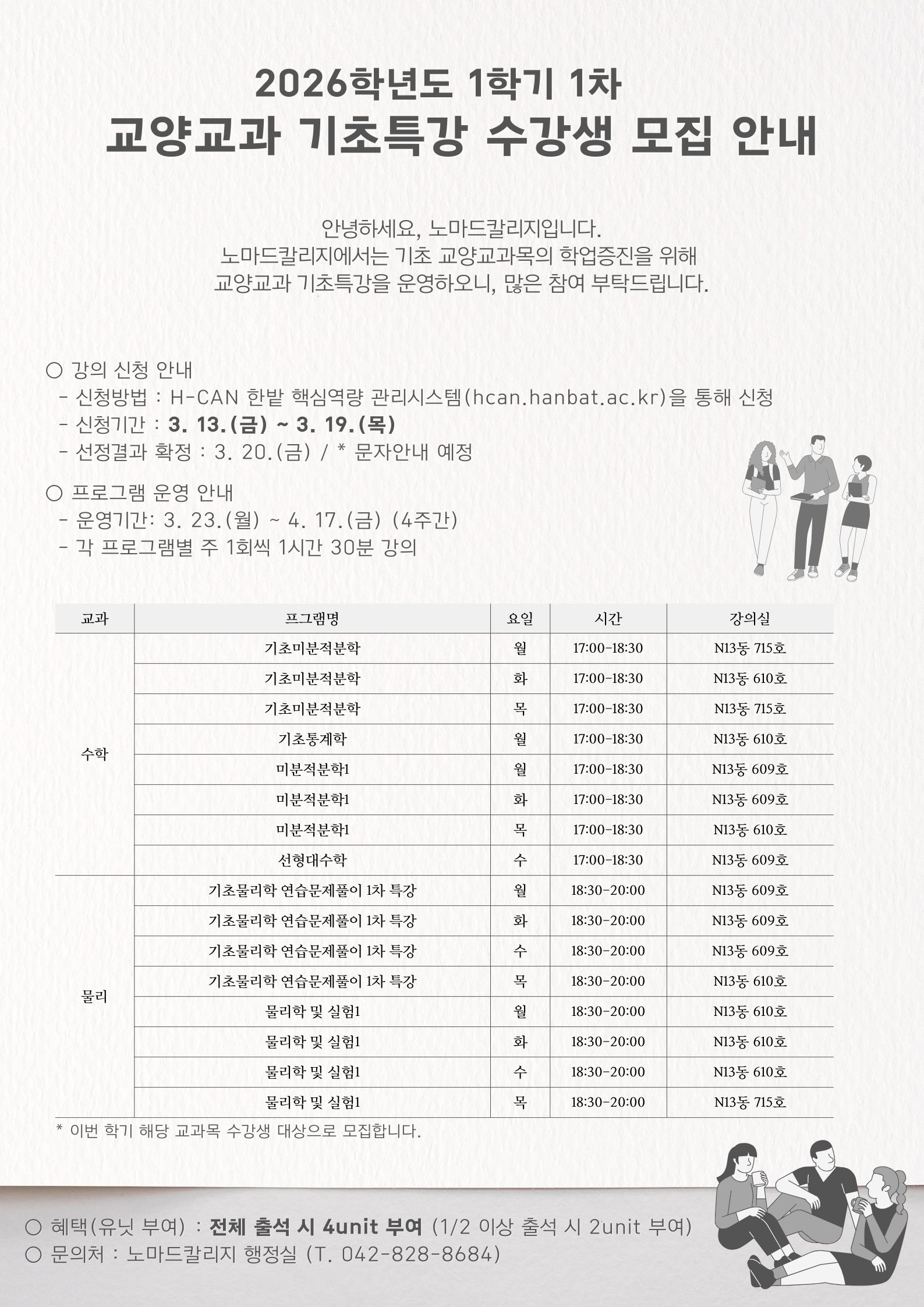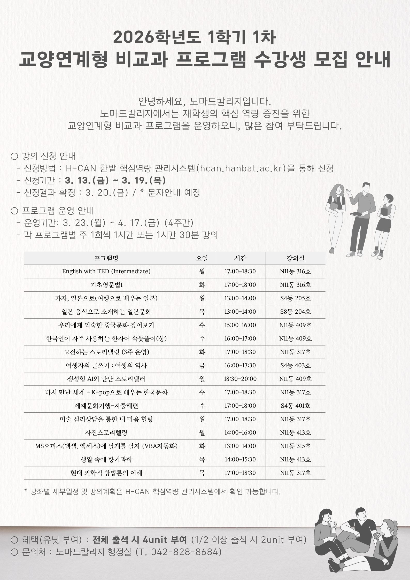 2026학년도 1학기 1차 교양연계형 비교과 프로그램 및 교양교과 기초특강 수강생을 3월 13일(금)부터 모집합니다.