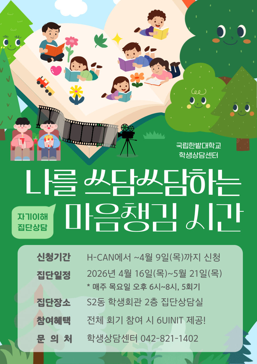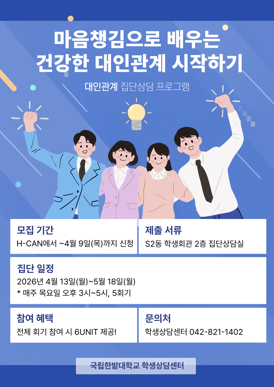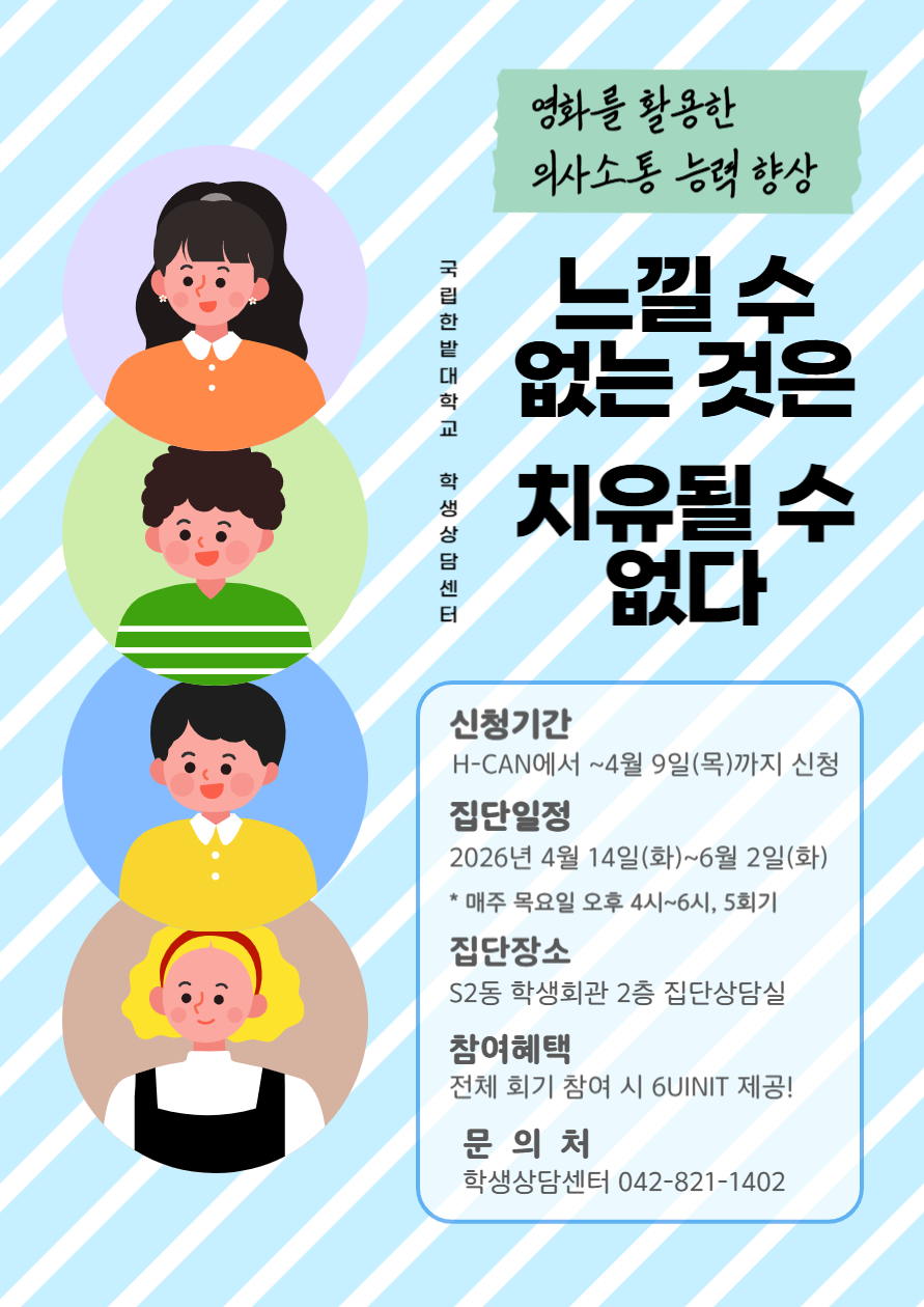 학생상담센터에서 운영하는 2026학년도 1학기 집단상담 프로그램을 안내합니다.