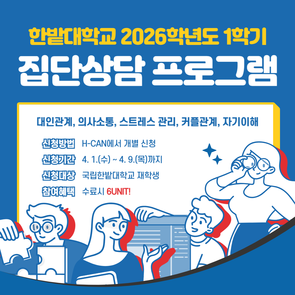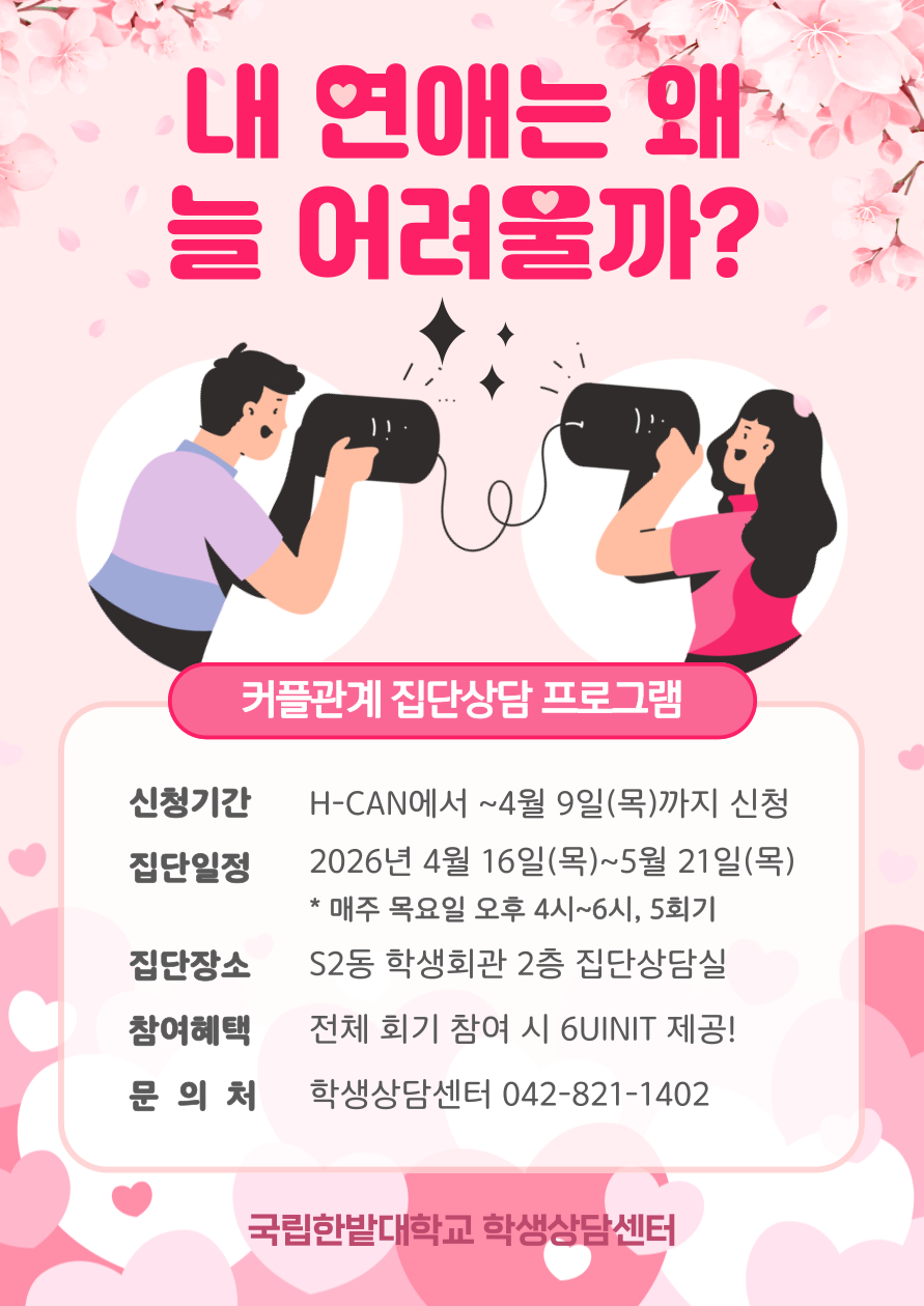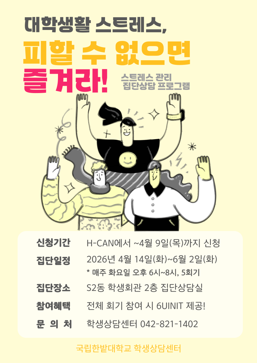 학생상담센터에서 운영하는 2026학년도 1학기 집단상담 프로그램을 안내합니다.
