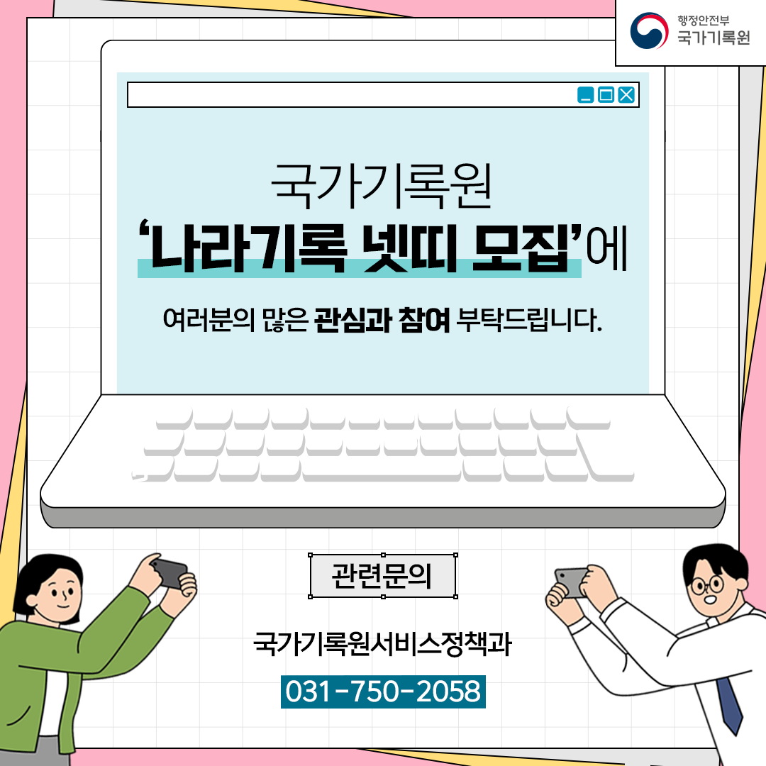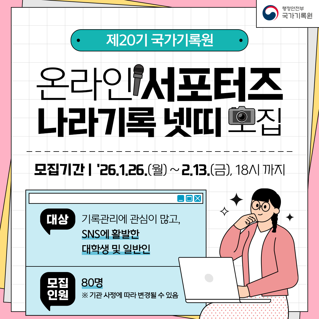 국가기록원에서는 기록문화 대국민 인식 확산 및 국가기록 콘텐츠 온라인 서비스 활성화 등을 위해 제20기 온라인서포터즈(나라기록 넷띠)를 모집하고 있습니다.