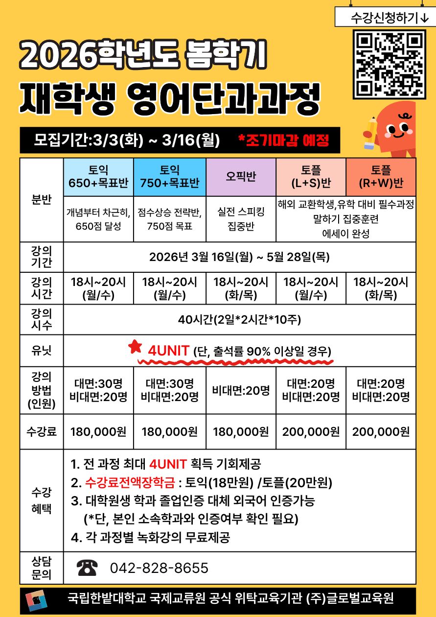 # 기타 문의: 어학운영실 (042-828-8655)