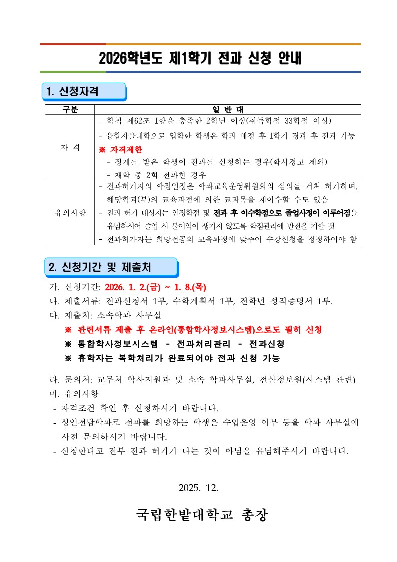 [학사지원과] 2026학년도 제1학기 전과 신청 안내