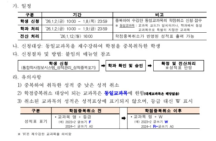 [학사지원과] 2025학년도 제2학기 학점중복 취소 신청기간 안내