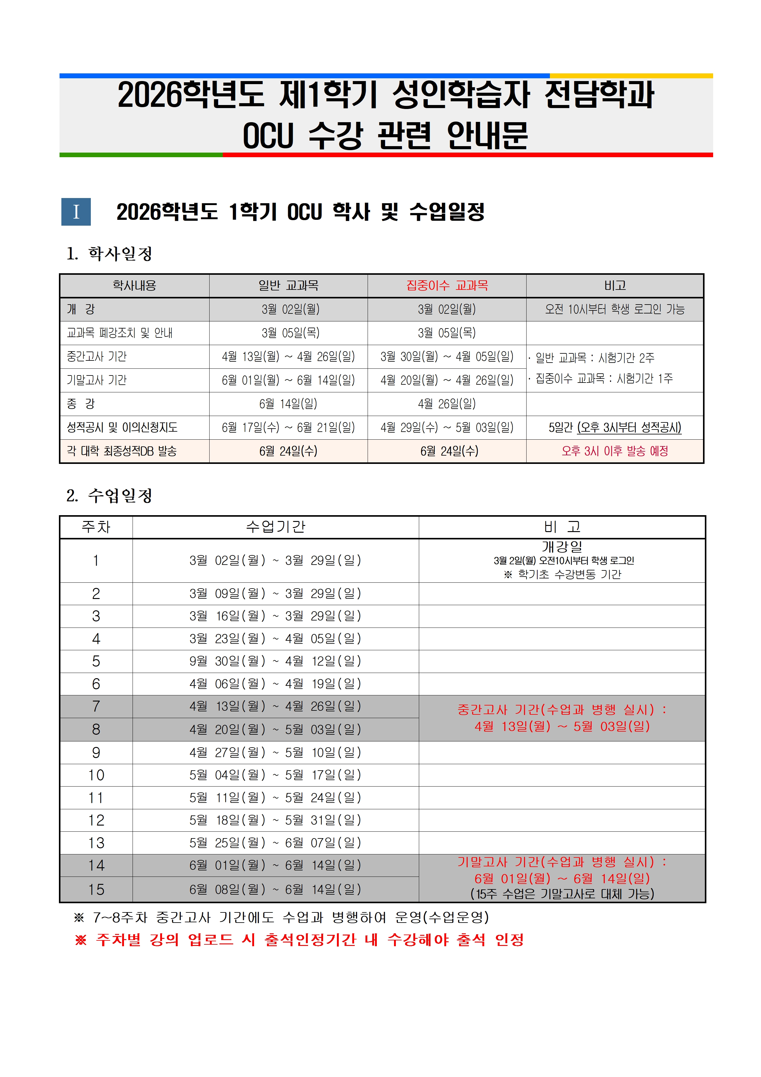 2026학년도 1학기 성인학습자 전담학과 OCU 수강관련 내용을 아래와 같이 안내드립니다.
