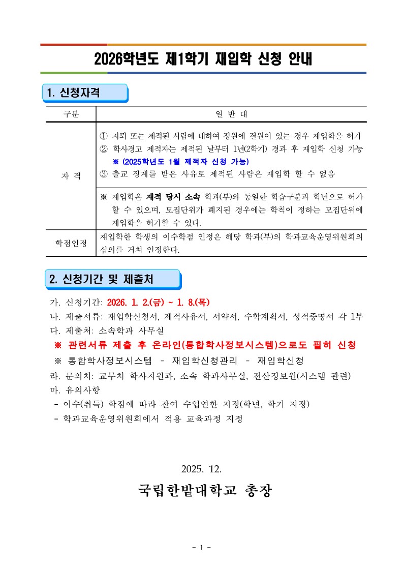 [학사지원과] 2026학년도 제1학기 재입학 신청 접수 안내