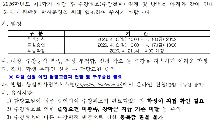 [학사지원과]2026학년도 제1학기 개강후 수강취소(수강철회) 안내(학생신청 : 2026. 4. 6.(월) 10:00~ 4. 10.(금) 23:59)