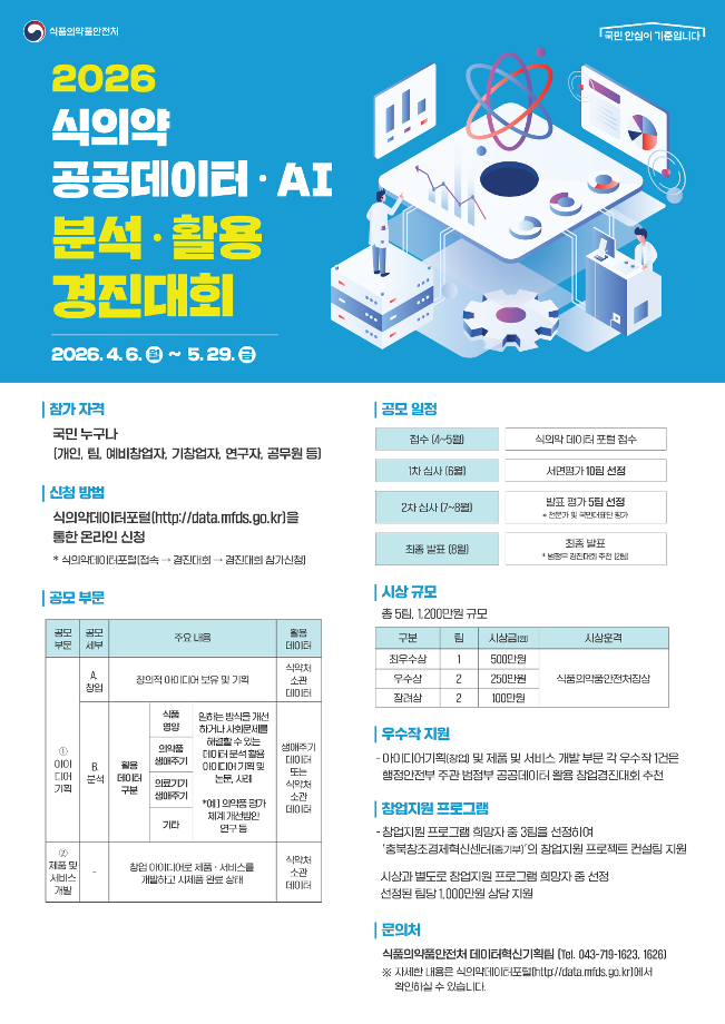 식품의약품안전처에서는 식의약 데이터를 활용한 민간의 창의적인 아이디어를 발굴하여 창업 촉진 및 식의약 현안 문제 도출과 해결을 위해「2026년 식의약 공공데이터·ai 분석·활용 경진대회」를 다음과 같이 개최합니다.