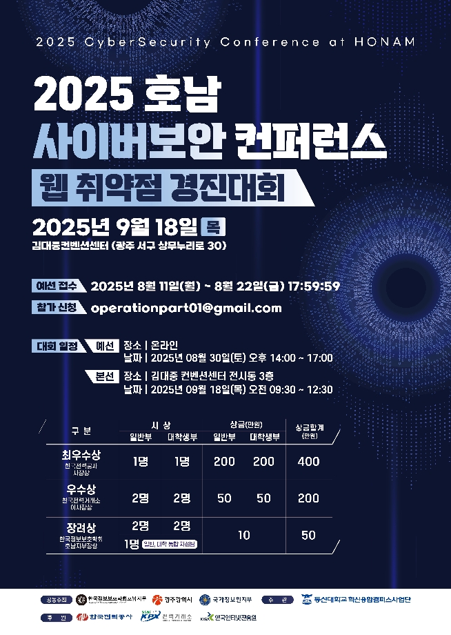 동신대학교에서는 학생들의 사이버보안 대응 역량 강화 및 보안인재 육성 발굴 등을 위해 전국 대학생 및 일반인 대상으로 웹 취약점 경진대회를 개최합니다.