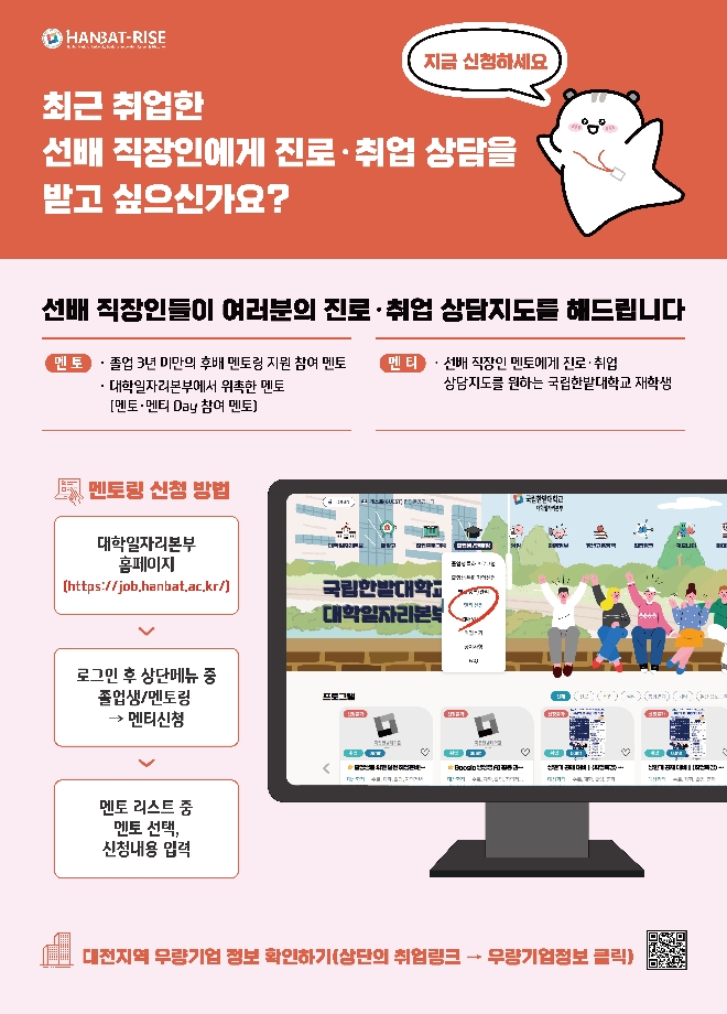 - 대학일자리본부에서 위촉한 멘토 및 졸업 3년 미만의 신규 참여 희망자