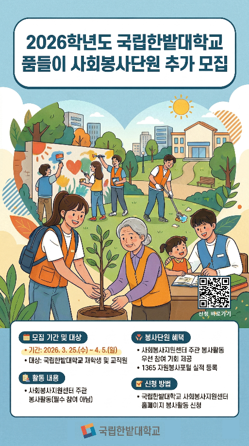 사회봉사활동의 원활한 운영을 위해 2026학년도 국립한밭대학교 품들이 사회봉사단원을 추가모집하오니 많은 참여 바랍니다.